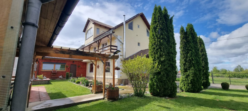 DETALII TEHNICE: Pensiunea dispune de incalzire cu centrala pe lemne si calorifere in fiecare camera, curentul electric este trifazic, panouri fotovoltaice cu sistem de stocare si contract de prosumator, sistem de supraveghere video, put cu hidrofor si bazin de stocare apa.